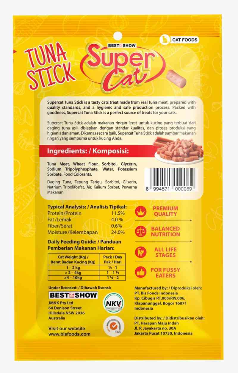 Best In Show Supercat Tuna Stick is a delicious treat made from real tuna meat. Its soft, chewy texture makes it easy for cats to enjoy, while the high protein content supports muscle health and overall vitality. Perfect as a snack between meals or as a reward during training, this treat ensures your cat stays happy and healthy.